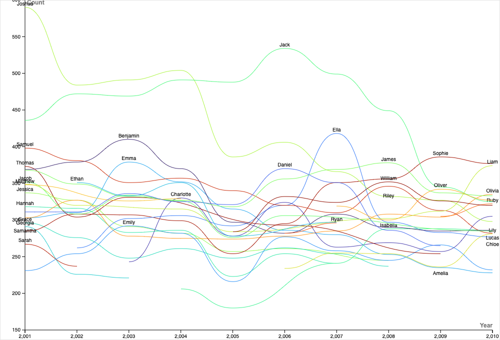 Using the most popular baby names in New Zealand from the 2001-2010 dataset, I decided to explore the trends of baby names with a line graph. This way, I could show the popularity rankings of different baby names throughout the years. Using a line graph was the most appropriate in this case because it allowed for easy comparison of multiple names over time, and you want to use a line graph when you are looking at trends over time. Next, I wanted to improve the clarity of my visualization, so I changed the color scale to have enough colors to assign a different color to each baby’s name. Thus, it makes it easier to distinguish between the different names. I also changed the width of the graph, so you can see how the popularity of different baby names changed over the full 10 years. In addition to this, I made sure to label everything clearly. The X-axis was the year, the Y-axis was the count, the lines were the name, and the color was the name as well. Before creating my graph, I read over the different charts in the Data Visualization Catalogue that Lin recommended. I did notice, however, that it is best to avoid so many lines on the graph and to divide the chart into smaller multiples. I tried implementing this approach, but the charts turned out all cluttered. My visualization relates to DH principles discussed in Lin’s lecture, in particular, as it shows the power behind data visualization. Using Digital Humanities principles discussed in Lin’s lecture, I was able to visualize the entire dataset over the whole period in one chart to uncover the patterns of popularity of the different names. Using these trends, I could see how naming conventions have changed over time or even potentially cultural shifts. Overall, this is tied to DH because it combines both humanistic inquiry for analyzing and interpreting data in insightful ways with data visualization.